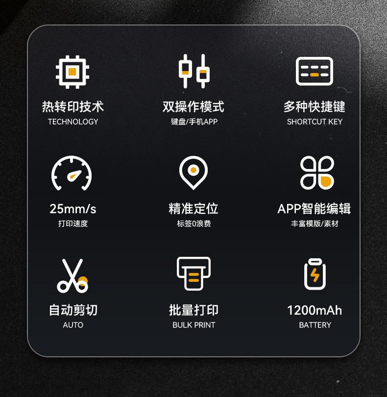 键盘、手机APP/电脑软件三端操控方式:支持蓝牙连接手机APP,无网络也可编辑排版,一键导入Excel批量打印。