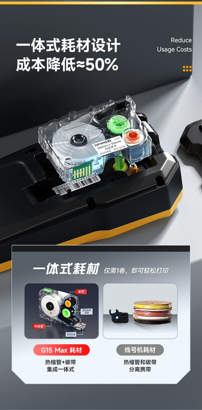 耗材一体化设计:碳带与标识集成,安装便捷,耗材盒体积小,支持多样化尺寸与类型。