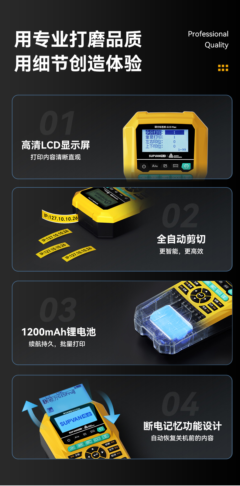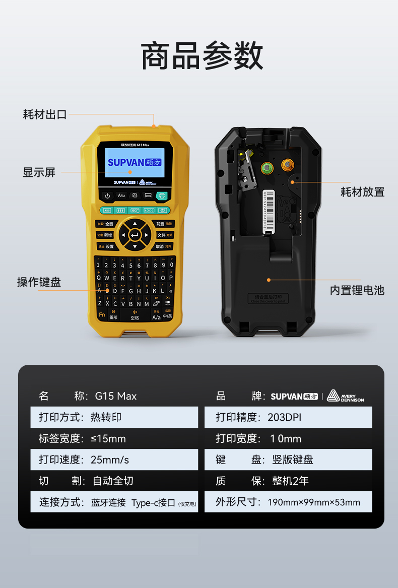 内置1200mAh锂电池:Type-C接口供电,支持充电宝充电,G15 MAX版本还可搭配电源适配器,实现长时间连续打印。